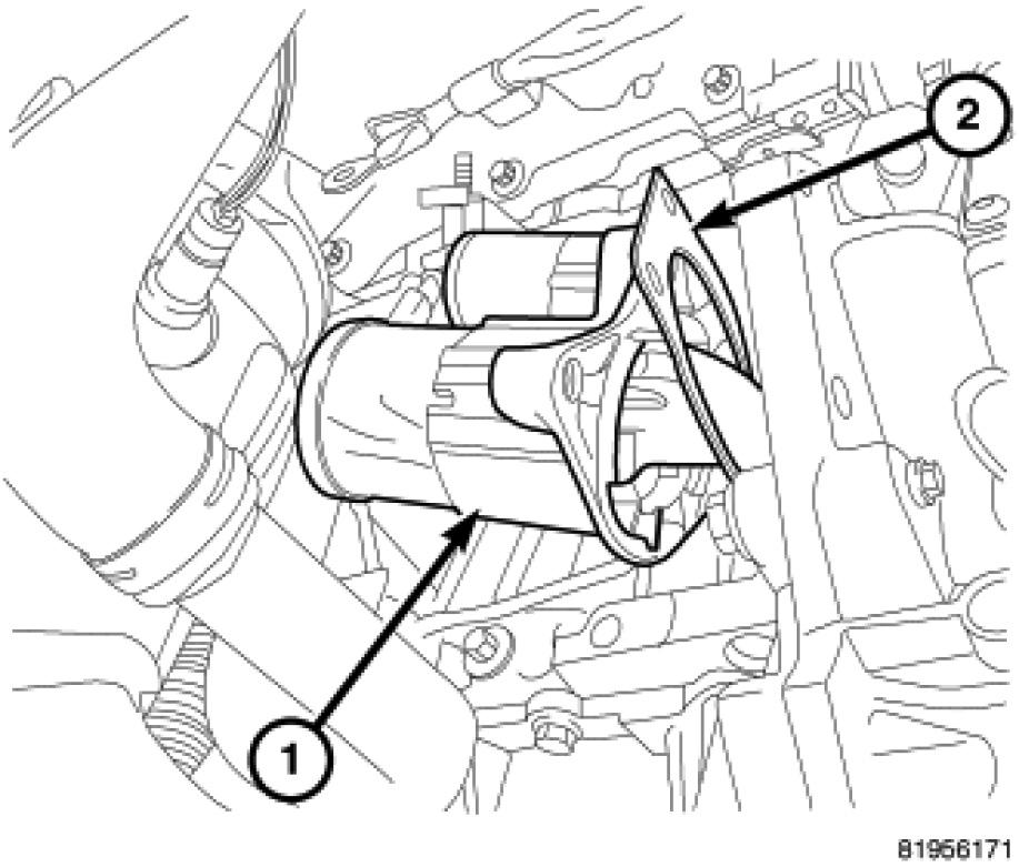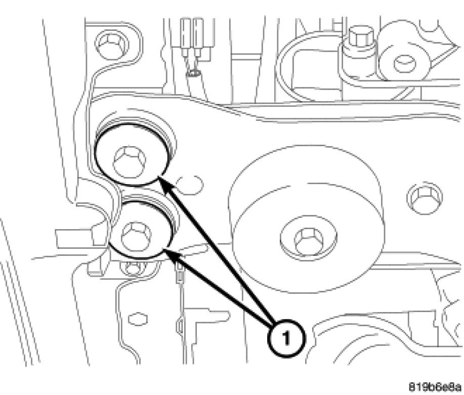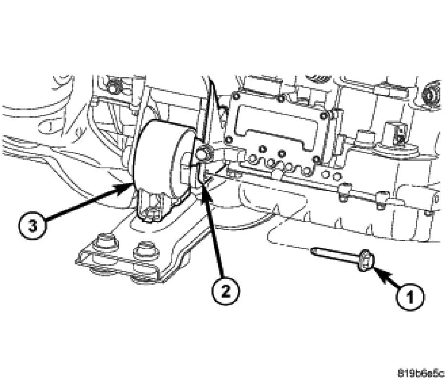 8. Install the engine anti-roll mount and bolts (1) and (2). Tighten to 50 Nm (37 ft.lbs.)