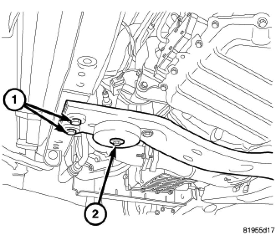 12. Install lower engine anti-roll mount bolt (2) and tighten bolts to 47 Nm (35 ft. lbs.).