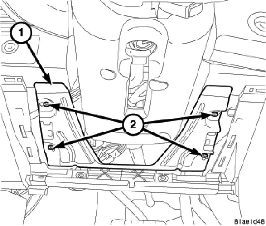 15. Remove the steering column cover reinforcement mounting screws (2). Remove the steering column cover reinforcement (1).