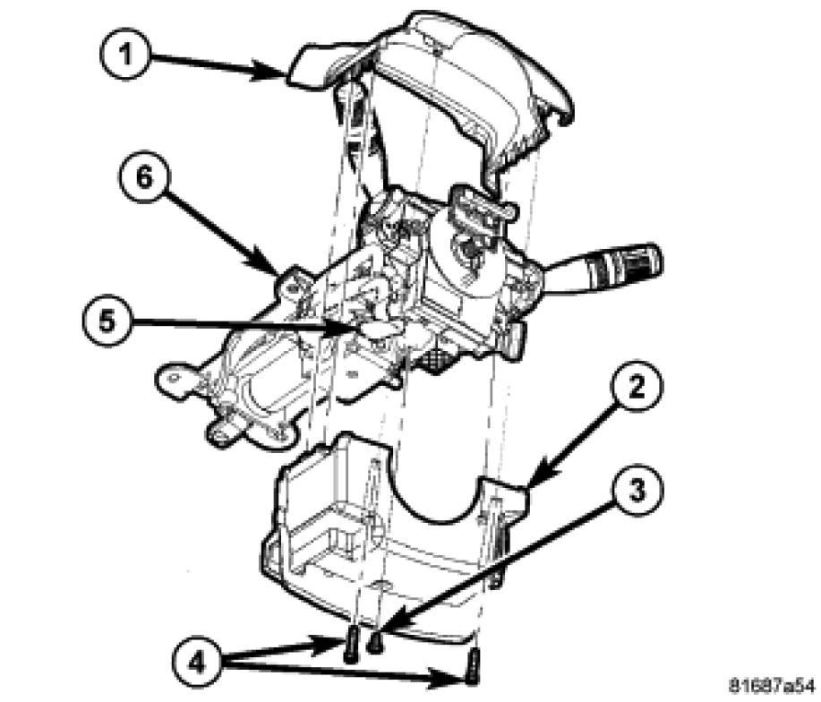18. Remove the screw (3) attaching the lower shroud (2) to the steering column (6). Remove the lower shroud.