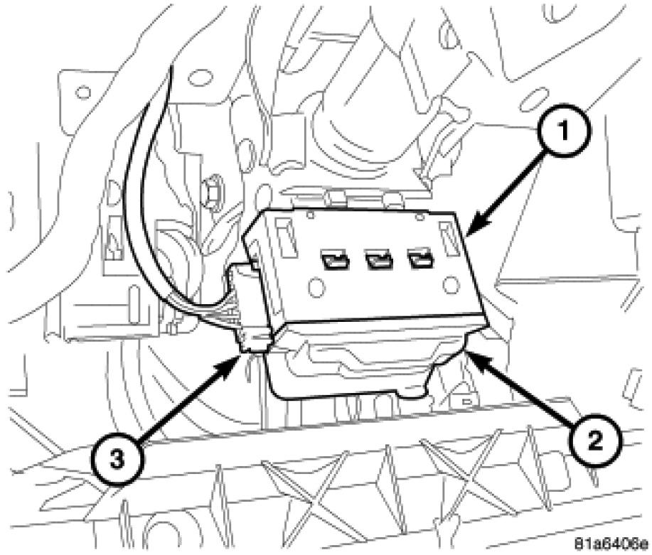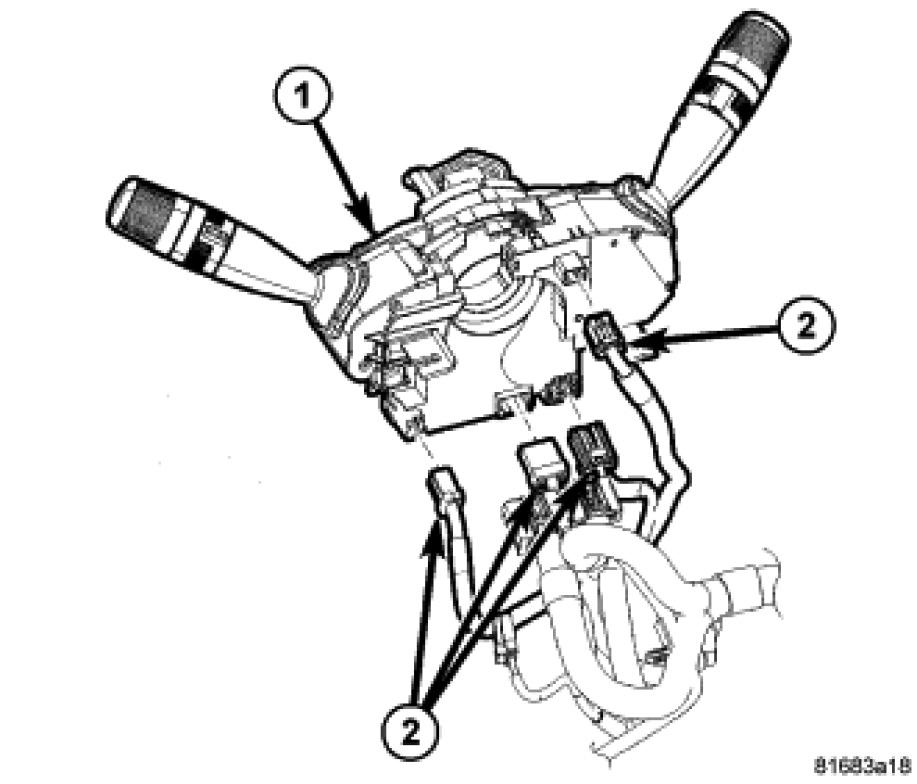 20. Disconnect the wiring harness connectors (2) at the Steering Column Control Module (SCCM) (1).
