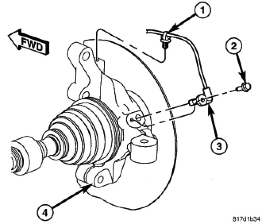 9. Install the wheel speed sensor head (3) into the knuckle (4). Install the mounting screw (2) and tighten it to 12 Nm (106 in. lbs.).