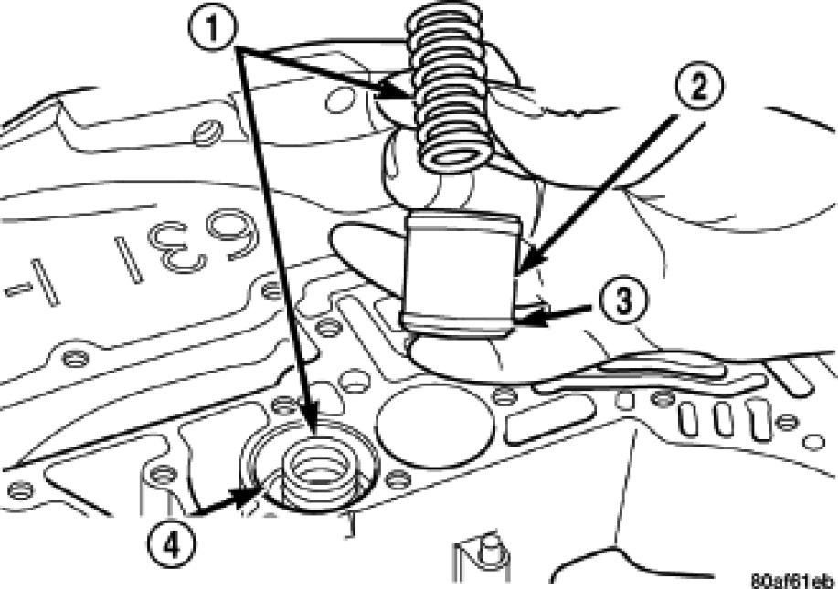 The 2/4 accumulator is located in the valve body (1). It is retained by a cover and retaining screws.