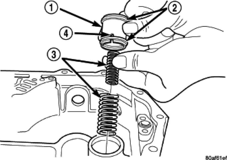 The 41TE underdrive, overdrive, low/reverse, and 2/4 clutch hydraulic circuits each contain an accumulator. An accumulator typically consists of a piston (2), seal rings (3) return spring(s) (1) and a cover or plug. The overdrive and underdrive accumulators are located within the transaxle case, and are retained by the valve body.
