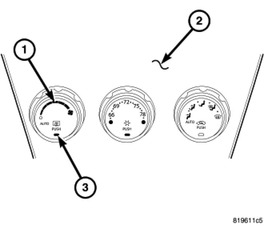 When equipped, the heated mirror system operates in concert with the rear window defogger (EBL) system and is controlled by the rear window defogger switch (1) located in the A/C-heater control (2) in the center of the instrument panel. An amber indicator lamp (3) in the rear window defogger switch will illuminate to indicate when the heated mirror system is turned on.
