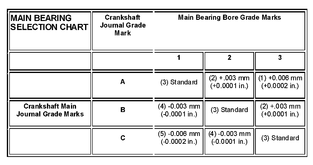 The grade marks for the crankshaft are located on the rearmost crankshaft counter weight. The crankshaft journal grade marks (A, B, or C) are read left to right, corresponding with journal number 1, 2, 3, 4. For an example, if the main bore grade on the side of the engine block is 3 and the journal grade on the #9 counterweight of the crankshaft is B, the proper select fit bearing would be a (2) +0.003 mm (+0.0001 in.).