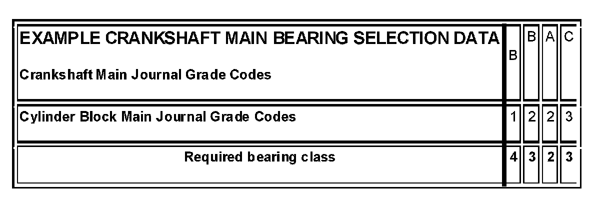 This example shows how to determine the bearing class needed for each crankshaft main journal, assuming that a new crankshaft is being installed in a new or existing engine block. If the code 'B' 'B' 'A' 'C' is stamped on the #9 counterweight of the crankshaft (3), and the code '1' '2' '2' '3' is stamped on the side of the engine block (1), then main #1 would require Class 4 bearings, main #2 would require Class 3 bearings, main #3 would require Class 2 bearings, and main #4 would require Class 3 bearings.