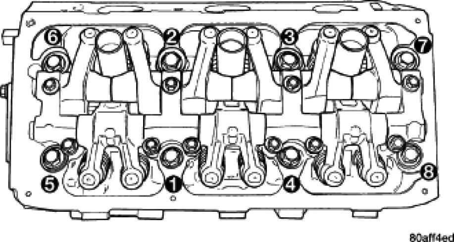 The cylinder head bolts are tightened using a torque plus angle procedure. The bolts must be examined BEFORE reuse. If the threads are necked down the bolts must be replaced.