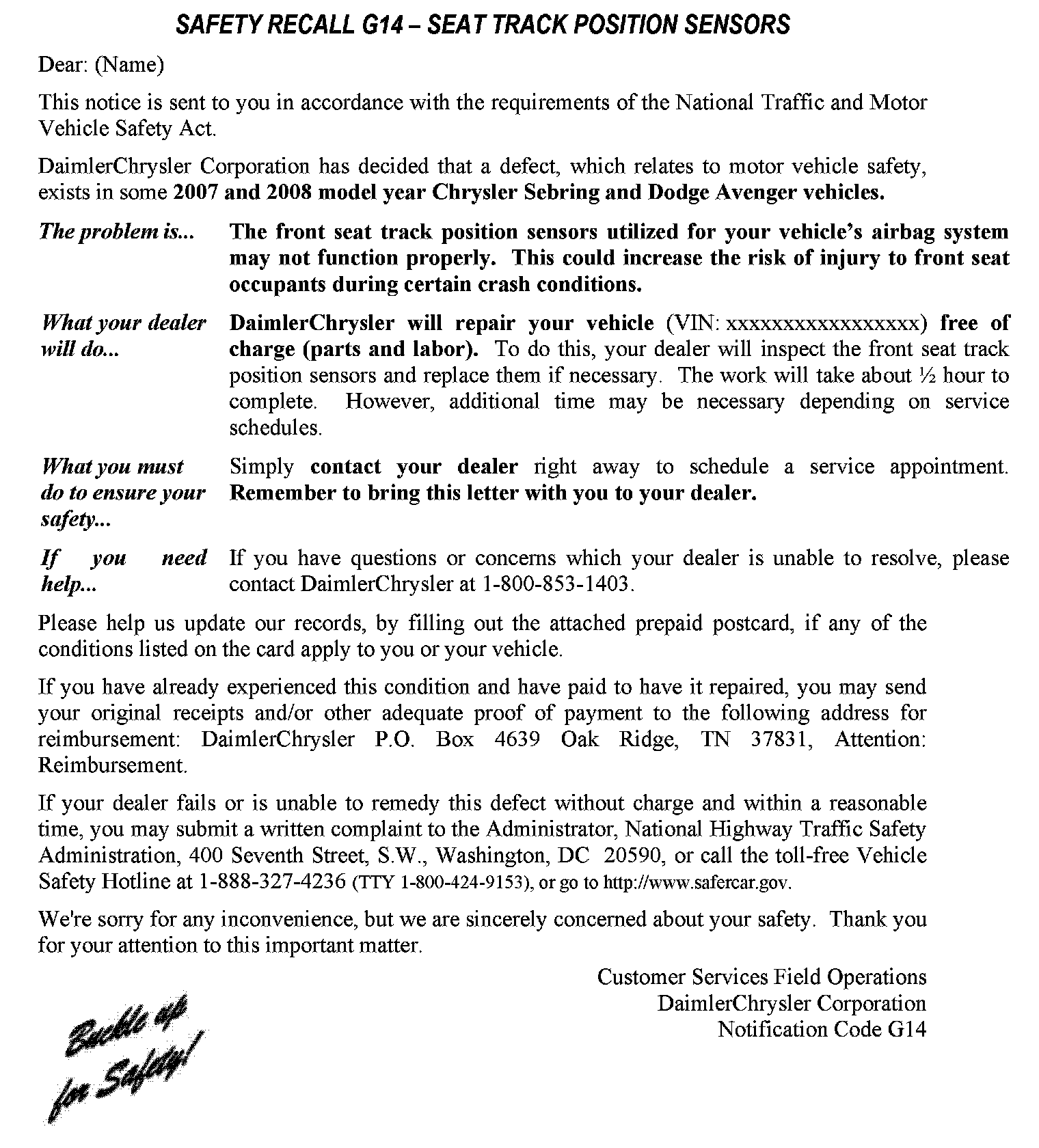 Recall - Seat Track Position Sensor