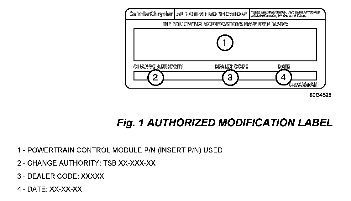 9. Type the necessary information on the "Authorized Modification Label p/n 04275086AB and attach near the VECI label (Fig 1).