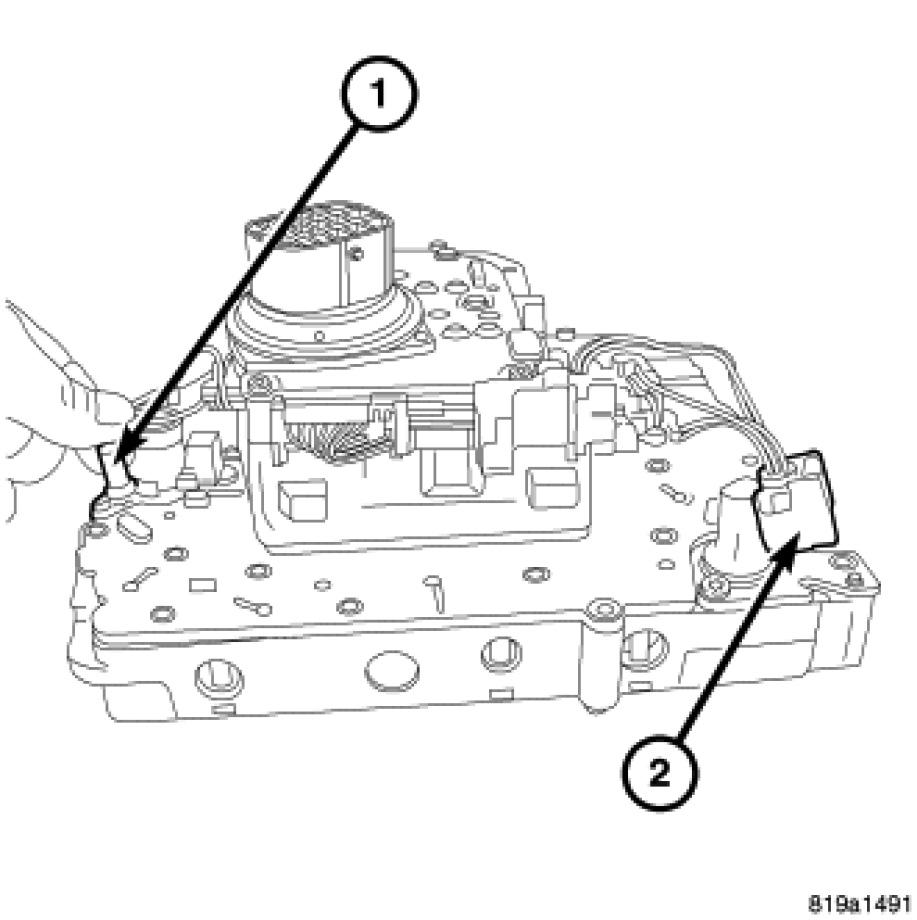 3. Connect the electrical connectors (1, 2) to the pressure control solenoid and line pressure sensors.