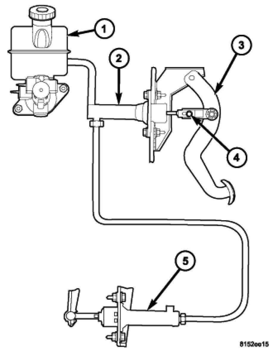 The typical clutch hydraulic system consists of a clutch master cylinder (2), slave cylinder (5), and an interconnecting fluid line. Clutch hydraulic fluid is supplied by the brake system via the brake master cylinder reservoir (1).