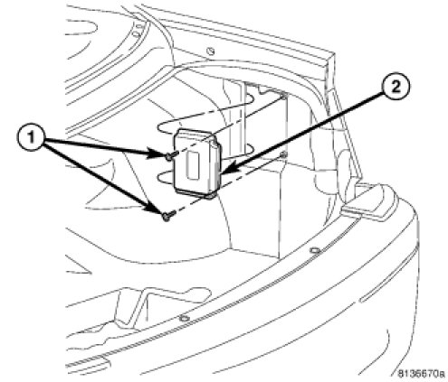 2. Position the Park Assist Module (2) and install the two attaching screws (1). Torque screws to 3.5 Nm (30 in. lbs.).