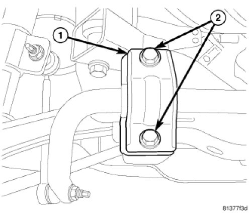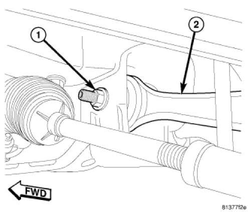 NOTE: If installing a lower control arm engine cradle bolt that is a wheel alignment adjustment bolt (1) (lengthwise grooved shaft (2)), make sure to install it in the same position which it was in upon removal. For more details on installation of this special bolt, Service and Repair.