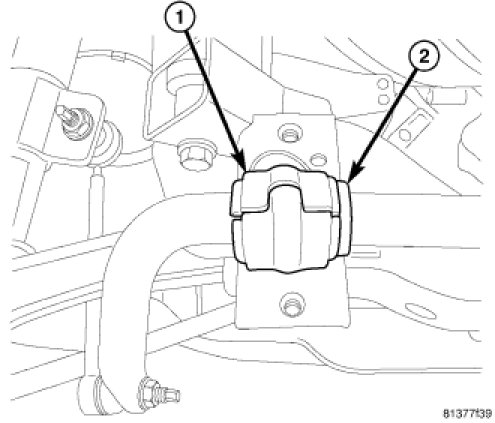 13. Utilizing slit in bushing, install stabilizer bar bushing (1) against locating collar on stabilizer bar (2) as shown. Make sure slit in bushing is positioned toward rear of vehicle.