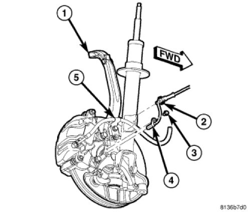 5. Attach wheel speed sensor cable and routing clip (2) to brake flex hose routing bracket (5).