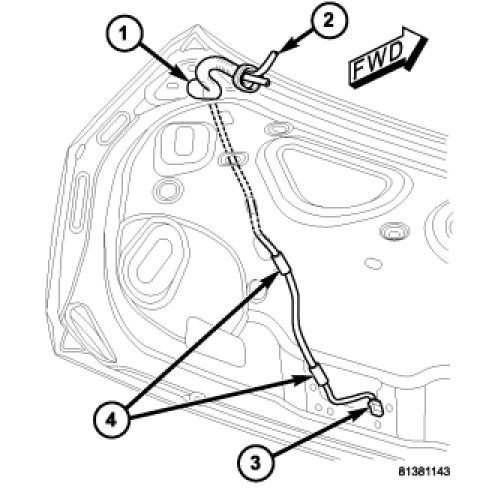5. Disengage the two retainers (4) that secure the deck lid take out (2) of the body wire harness to the underside of the deck lid.