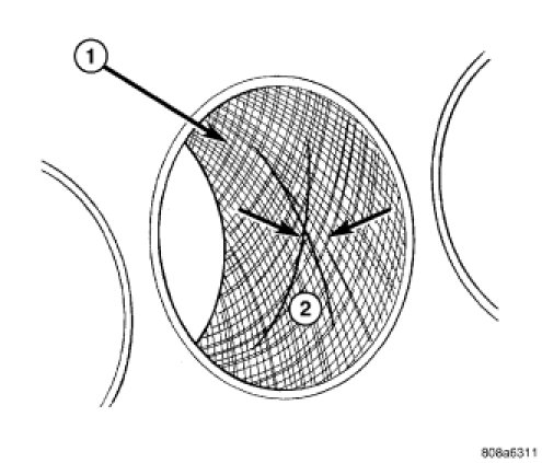 3. Honing should be done by moving the hone up and down fast enough to get a cross-hatch pattern (1). When hone marks intersect at 40-60 degrees (2), the cross hatch angle is most satisfactory for proper seating of rings.