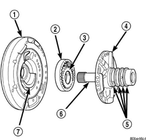 The oil pump is located in the pump housing inside the bell housing of the transmission case. The oil pump assembly consists of an inner (3) and outer (2) gear, a housing (1), and a cover that also serves as the reaction shaft support (6).