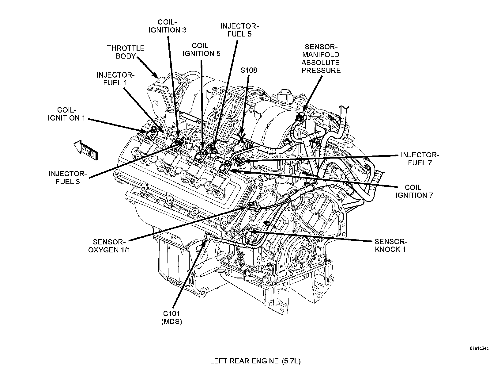 The 5.7L engine (345 CID) eight-cylinder engine is a 90� V-Type lightweight, deep skirt cast iron block, aluminum heads, single cam, overhead valve engine with hydraulic roller tappets. The heads incorporate splayed valves with a hemispherical style combustion chamber and dual spark plugs. The cylinders are numbered from front to rear; 1, 3, 5, 7 on the left bank and 2, 4, 6, 8 on the right bank. The firing order is 1-8-4-3-6-5-7-2.