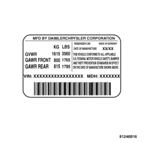 A vehicle safety certification label is attached to every DaimlerChrysler Corporation vehicle. The label certifies that the vehicle conforms to all applicable Federal Motor Vehicle Safety Standards. The label is located on the driver door shut-face.