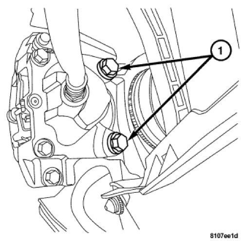 3. Install the caliper to the knuckle. Install the mounting bolts. Tighten to 55 Nm (41 ft. lbs.).