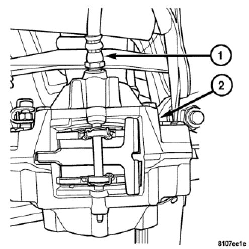 2. Install the brake hose (1) to caliper (2) by holding the brake hose (1) with a line wrench and rotating caliper (2) until snug. Fully tighten the brake hose after the caliper is installed.