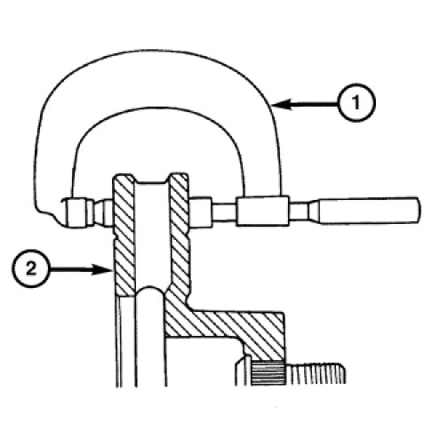 Measure rotor (2) thickness a minimum of six points around the rotor face with a micrometer (1). Position the micrometer approximately 3/4 in. (19 mm) from the rotor outer circumference for each measurement.