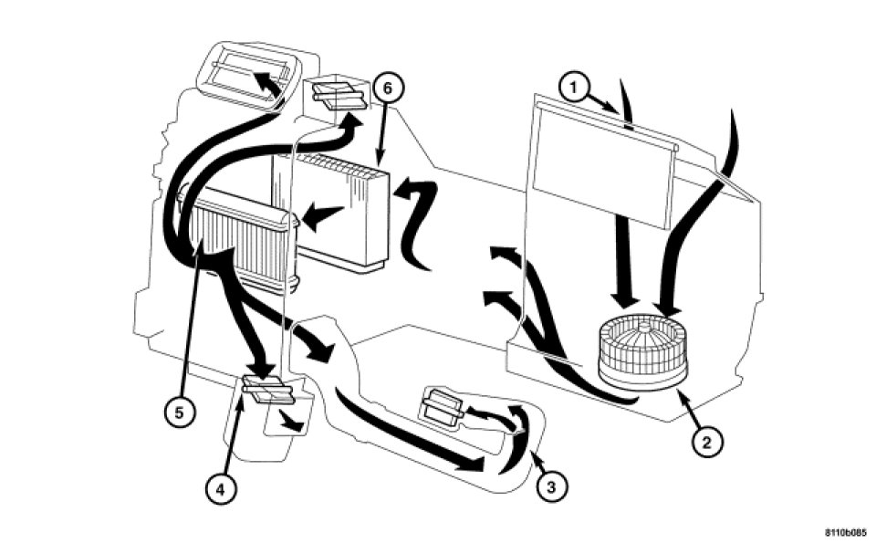 The Air Conditioning System is designed to provide the passenger compartment with low temperature and low humidity air. The Evaporator (6), located in the HVAC housing behind the Instrument Panel, is cooled to temperatures near the freezing point. As warm damp air passes through the cooled Evaporator (6), the air transfers its heat to the refrigerant in the Evaporator (6) and the moisture in the air condenses on the Evaporator fins.