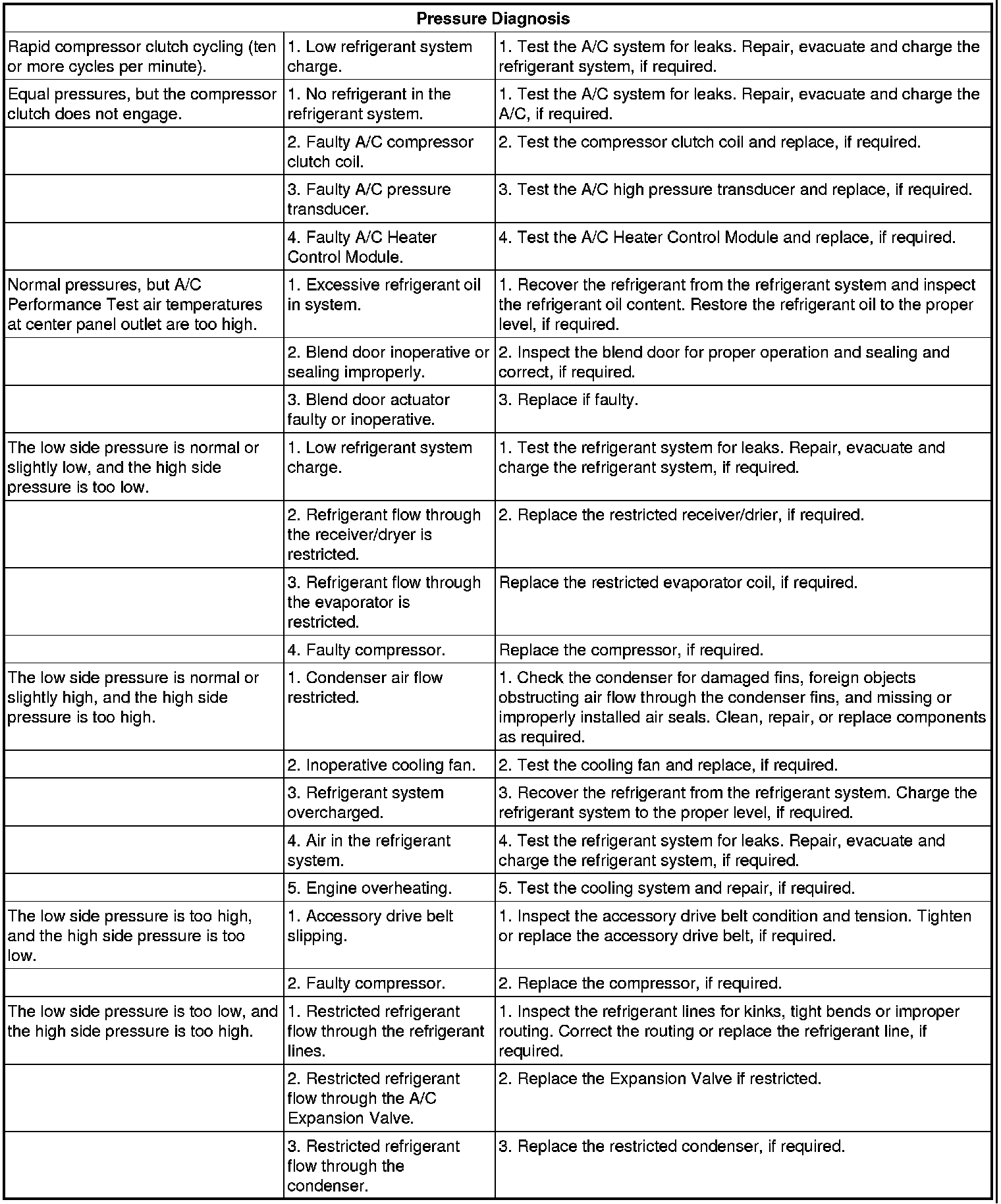 9. Compare the compressor discharge pressure to the Performance Temperature and Pressure chart. If the compressor discharge pressure is high, see the Pressure Diagnosis chart.