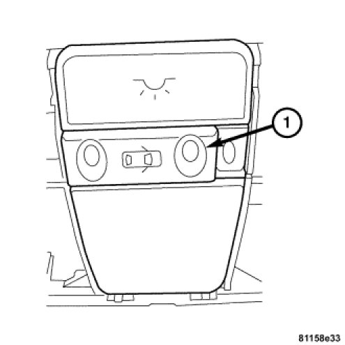 With the courtesy lamp defeat switch in the "O" position (1), the courtesy lamps are prevented from illuminating when the doors are opened. With the courtesy lamp defeat switch in the "-" position, the courtesy lamps illluminate when the doors are opened, then fade to off approximately 8 seconds after the last door is closed (unless the courtesy lamp switch is depressed). If a door remains unclosed, the lamps will remain on for approximately 5 minutes. At this time the Body Control Module will interrupt the ground path to conserve battery power. The courtesy lamp defeat switch is an integrated part of the courtesy lamp unit assembly and cannot be adjusted or repaired. If faulty, worn, or damaged, the entire assembly must be replaced. For complete courtesy lamp unit removal procedures, refer to Courtesy Lamp Unit removal.