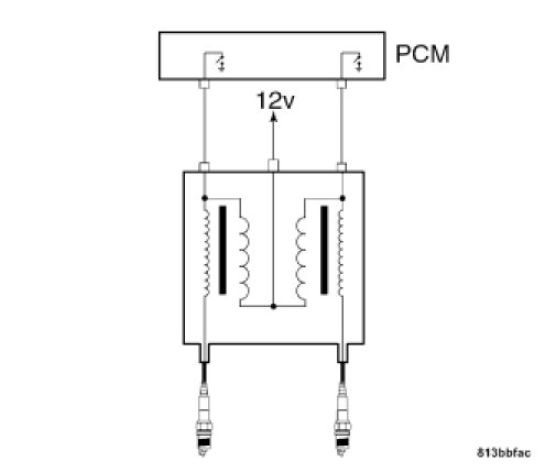 Each cylinder has a double coil set, and its own dedicated spark plug wire. The coils are controlled by the PCM. The coils can be fired simultaneously or in phases. The coils are phase-shift triggered, firing plugs A-B, then B-A, then A-B etc. The offset between the plug firing varies from 0° to 10°. Timing chainan be retarded by as much as 14.5°.