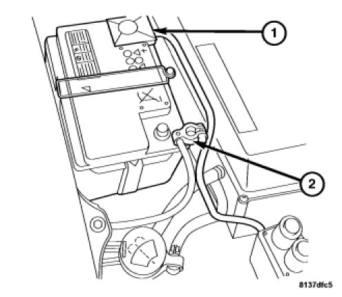 1. Verify the negative battery cable (2) is disconnected before proceeding. Wait two minutes for the system capacitor to discharge before further service.