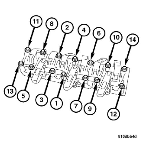 1. Follow the torque sequence shown for the crankshaft main bearing journal cap bolts.