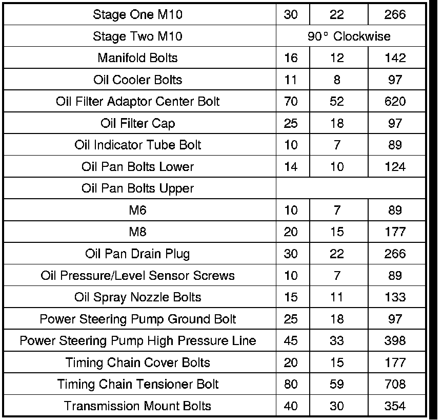 - Stage one for m10 bolts, 30 Nm (22 ft. lbs.).
