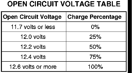 A battery open-circuit voltage (no load) test will show the approximate state-of-charge of a battery. This test can be used in place of the hydrometer test when a hydrometer is not available, or for maintenance-free batteries with non-removable cell caps.
