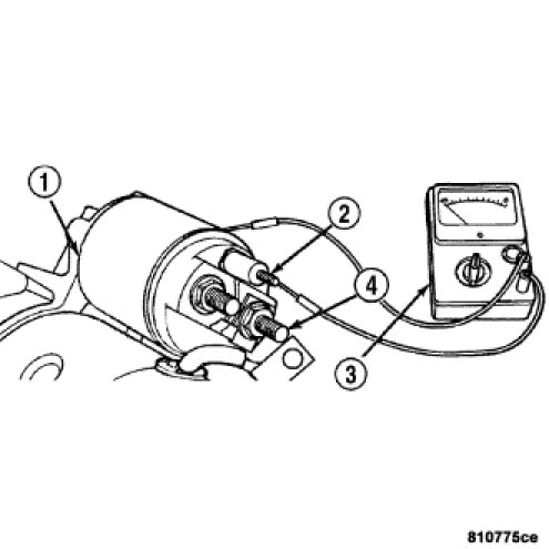 3. Check the solenoid (1) for continuity between the solenoid terminal (2) and the solenoid field coil terminal (4) with a continuity tester (3). There should be continuity. If OK, go to Step 4. If not OK, replace the faulty starter motor assembly.