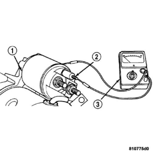 4. Using a continuity tester (3), check for continuity between the solenoid terminal (2) and the solenoid case (1). There should be continuity. If not OK, replace the faulty starter motor assembly.