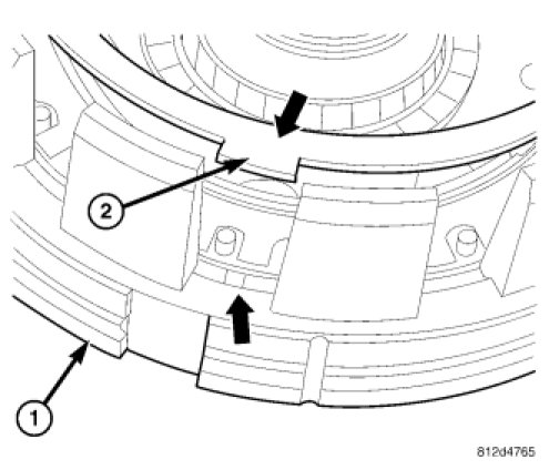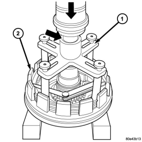 4. Insert disc spring (2) in the outer multiple-disc carrier. Observe the disc spring (2) installation position. The lugs of the disc spring (2) washer must align with the 3 raised pads (arrow) of the B1 multiple-disc carrier (1). The cone of the spring washer must point downwards.