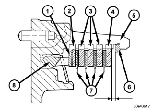 NOTE: Pay attention to the sequence of discs. If the original clutch discs are reused, be sure to return the disc identified on disassembly as belonging on top of the disc spring (5) to its original location.