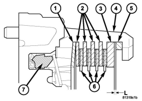 8. For transmissions using double sided friction discs, use a feeler gauge to determine the play "L" at three points between the snap-ring (6) and outer multiple-disc (4). During the measurement, the snap-ring (6) must contact the upper bearing surface of the groove in the outer multiple-disc carrier (5). The correct clearance for transmissions using double sided friction discs is 2.3-2.7 mm (0.091-0.106 in.) for two friction disc versions, 2.7-3.1 mm (0.106-0.122 in.) for three disc versions, and 3.0-3.4 mm (0.118-0.134 in.) for four disc versions.