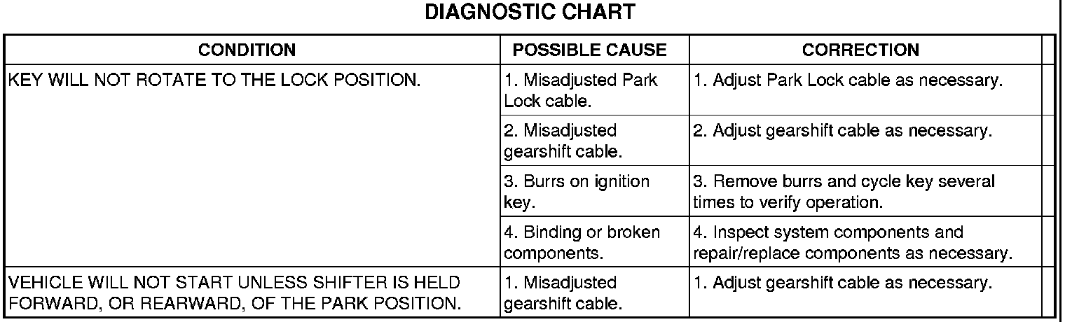 2. When the shift lever is in PARK, the ignition key cylinder should rotate freely from ACC to LOCK. When the shifter is in any other gear or neutral position, the ignition key cylinder should not rotate to the LOCK position.