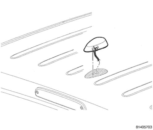 5. From inside the vehicle, and using a flat bladed tool, depress one of the retaining tabs on the antenna. Push up the one side of the antenna connector through the roof panel. Depress the other side of the connector and remove the antenna.
