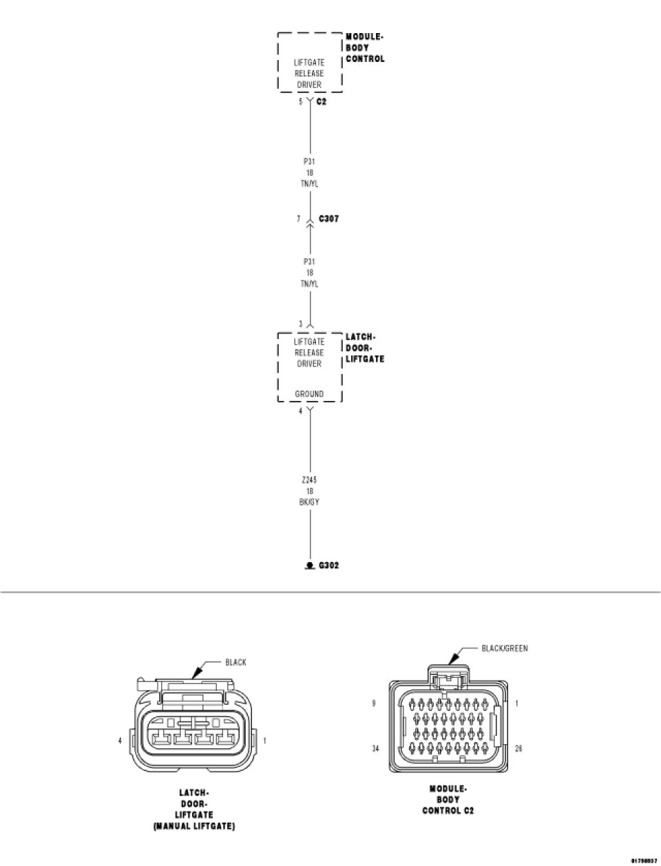 Measure the resistance of the (P31) Liftgate Release Driver circuit between the BCM C2 connector and the Liftgate Latch connector.