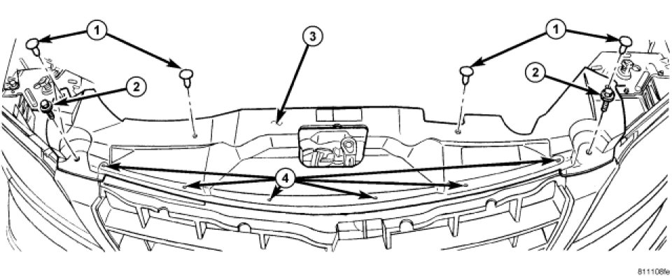 3. Install four push pins attaching radiator closure panel to radiator crossmember.
