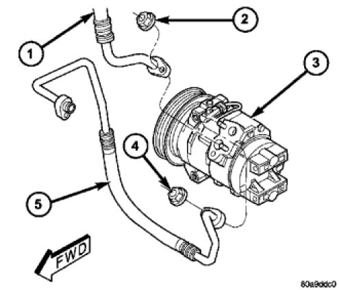 11. Connect the A/C suction line (1) and A/C discharge line (5) to the A/C compressor (3).