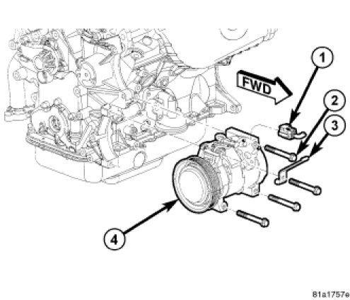 5. Loosely install the two upper retaining bolts that secure the A/C compressor and the engine wire harness bracket (3) to the engine. Tighten each of the fasteners to 54 Nm (40 ft. lbs.) using the following sequence: