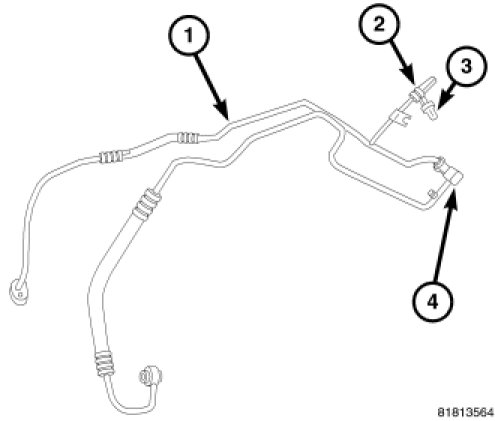 The A/C liquid line (1) is the refrigerant line that carries refrigerant from the A/C condenser to the A/C evaporator. The A/C liquid line contains the high side service port (2) and a fitting for the A/C pressure transducer (3) and is secured to the A/C expansion valve by the tapping block portion of the A/C suction line (4).