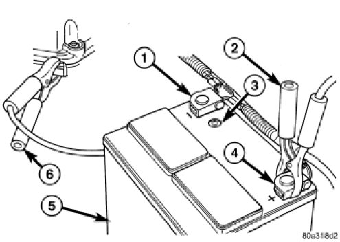 4. Connect jumper cables (2 and 6) to booster battery. RED clamp to positive terminal (+). BLACK clamp to negative terminal (-). DO NOT allow clamps at opposite end of cables to touch, electrical arc will result. Review all warnings in this procedure.