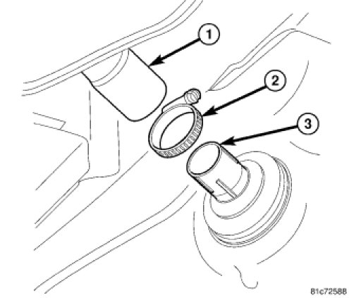 5. Install fuel fill hose (1) and clamp (2) to fuel tank (3), tighten clamp to 3 Nm (30 in. lbs.).